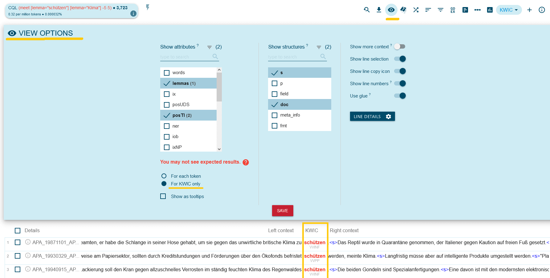 Nach einer erfolgten Suche kann über Auswahl der View options (dem Auge-Symbol in der Werkzeugleiste) die Anzeige angepasst werden. Hilfreich ist, dass hier die Anzeige einzelner Attribute oder Strukturen ein- oder ausgeblendet werden kann. In View Options kann auch angegeben werden, ob die ausgewählten Attribute nur für den eigentlichen Treffer (meist die beste Wahl) oder für alle Wörter der KWIC-Liste angezeigt werden sollen. Weiters besteht die Option, die ausgewählten Attribute as tooltips, d.h. nur bei mouse over anzuzeigen.