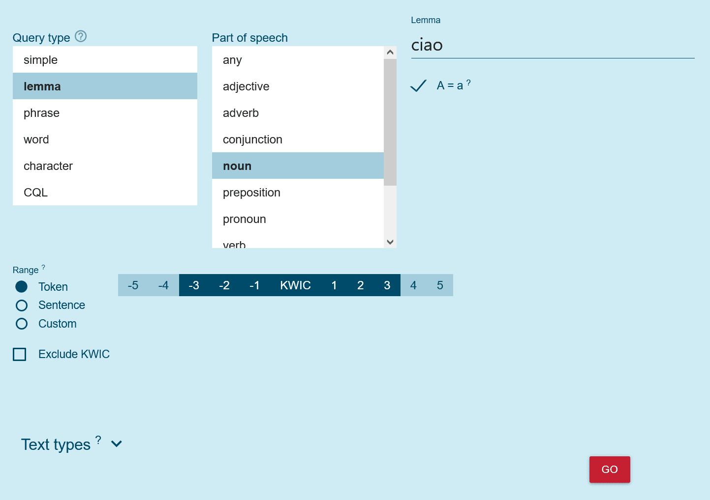 Alternativ können einfache Einschränkungen auf Basis der Metadaten auch im SkE user-interface vorgenommen werden. Dazu dient in der Suchmaske der Unterpunkt “Text Types”, wo die Suche auf <doc> mit spezifischen Attributwerten eingeschränkt werden kann.