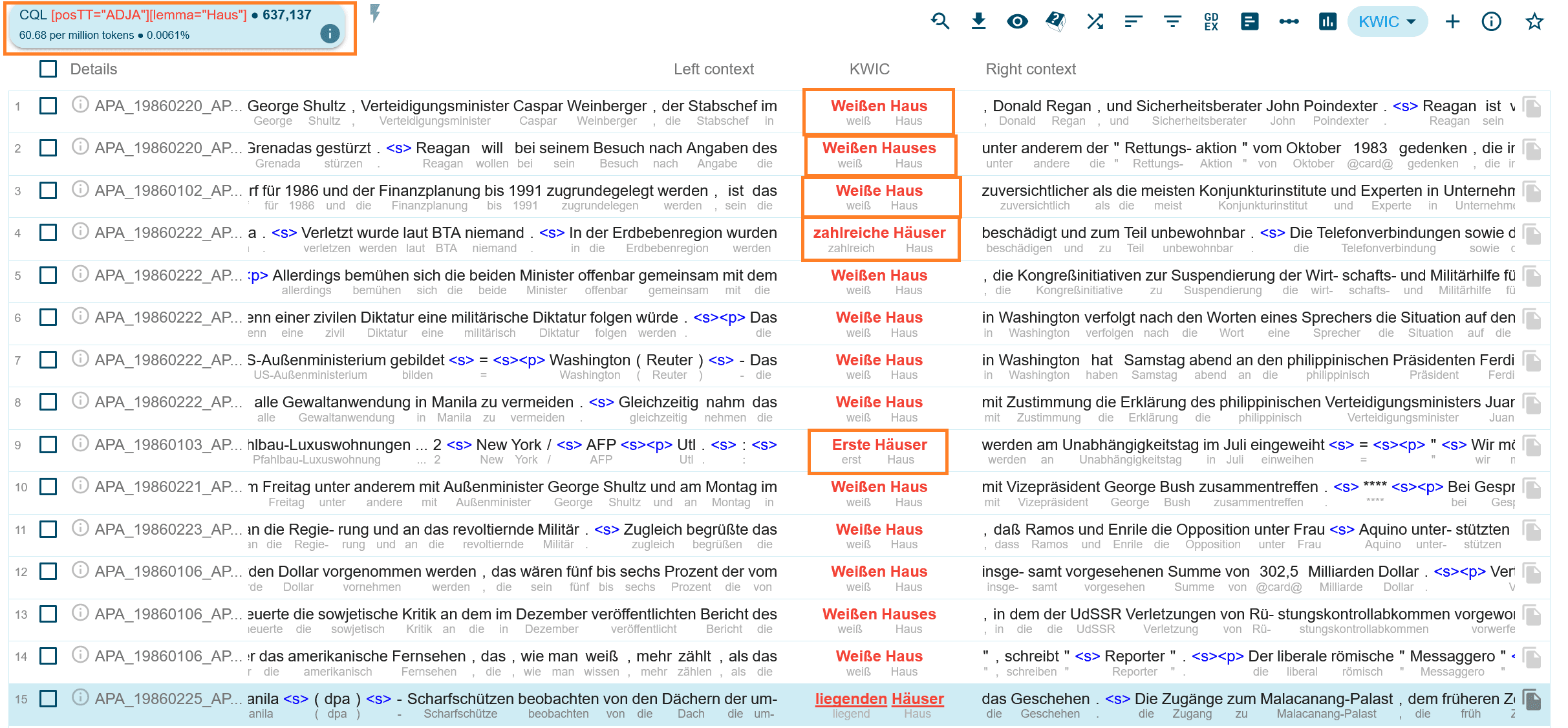 [ lemma="Haus" ]Alle Einträge, bei denen das Attribut “lemma” den Wert “Haus” aufweist – also “Haus” “Hauses” … “Häusern”