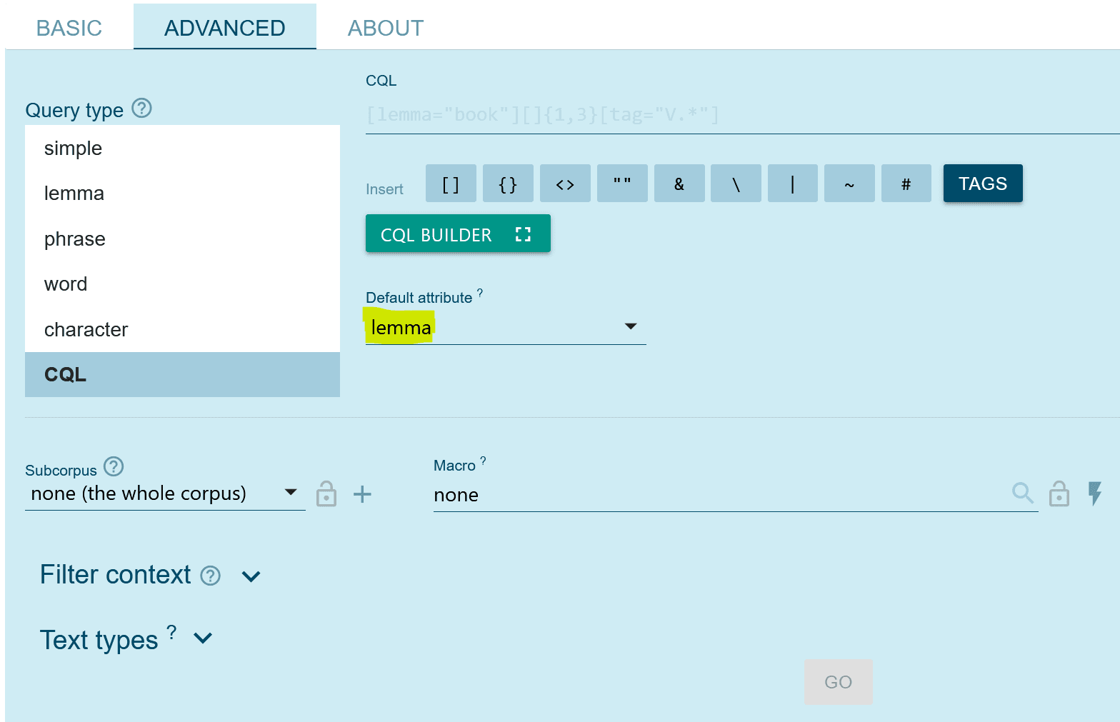 In der Advanced-Suchmaske sehen Sie in gelb unter der Schaltfläche für den CQL-Builder das Default attribute markiert. Beide Funktionen erleichtern die Erstellung von Abfragen.