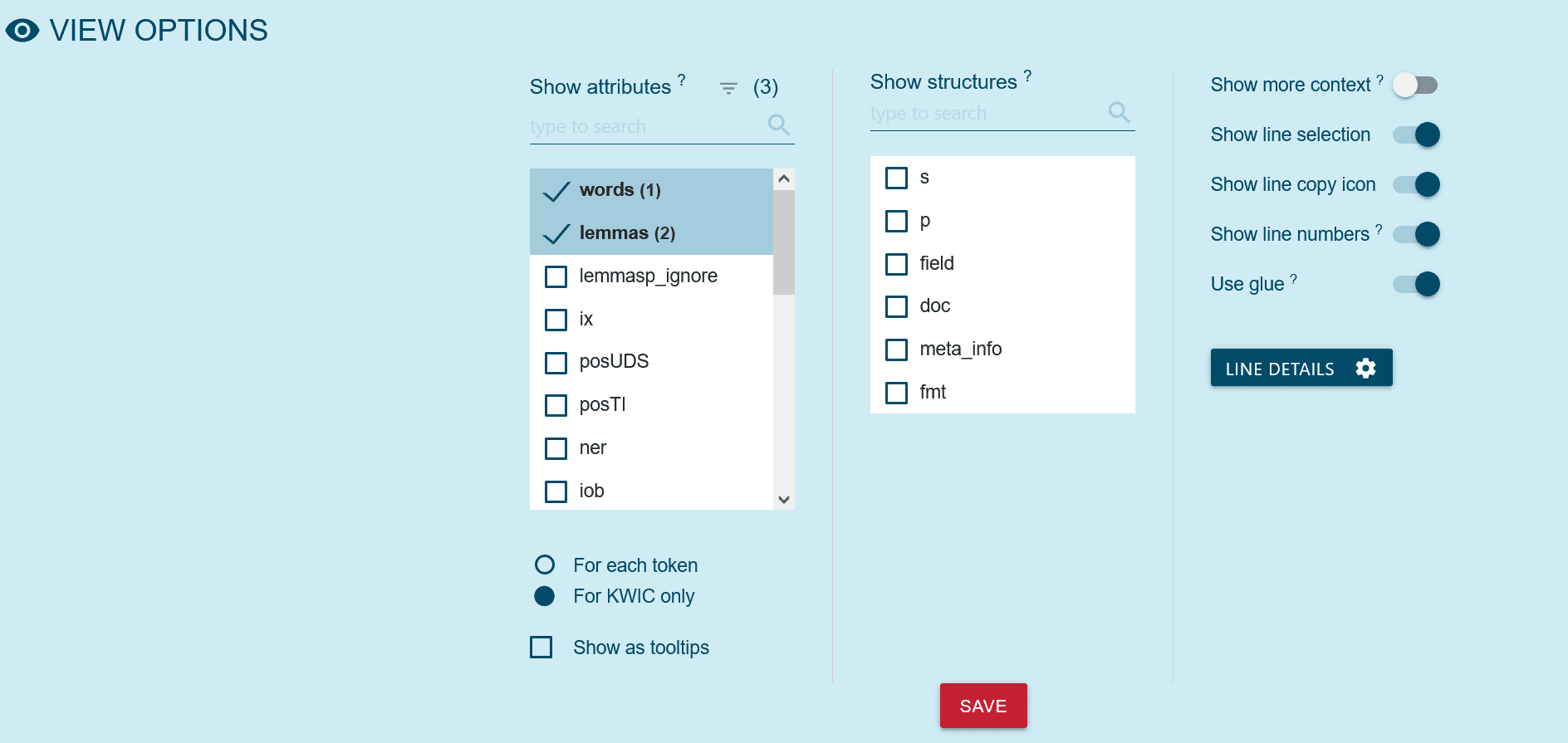 In den View Options kann man die Attribute, die den Token im Korpus zugeordnet sind, auswählen.
