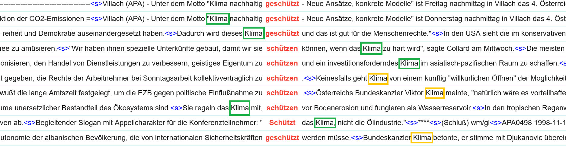 Und diese tokenisierten Texte können nun durch Struktur-Elemente, nun ja, strukturiert werden. Im Beispiel ist zu erkennen, wie diese Struktur-Elemente als XML-artige Spitzklammer-Annotationen die Token ergänzen.