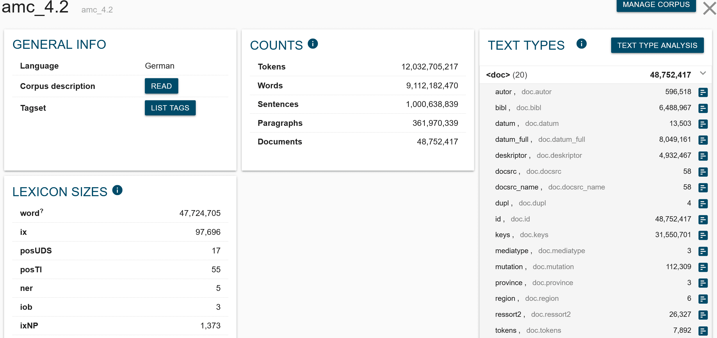 Die Corpus Info zeigt eine Übersicht aller vorhandenen Attribute, die bei der Suche in einem Corpus, in diesem Fall dem AMC 4.2, genutzt werden können.