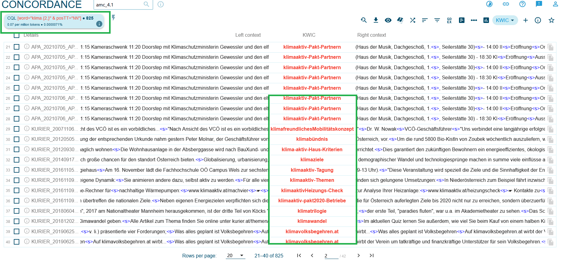 Die Texte im amc werden mit automatischen Annotationsverfahren wie Lemmatisierung und Part-of-Speech-Tagging mit linguistischen Informationen ergänzt, und über die Korpussuchmaschine NoSketch Engine zugänglich gemacht. Die NoSketch Engine ermöglicht eine präzise Textsuche und bietet Forschenden ein leistungsstarkes Werkzeug zur Untersuchung sprachwissenschaftlicher Fragestellungen. Durch diese umfassenden und gut strukturierten Ressourcen leistet das amc einen wesentlichen Beitrag zur wissenschaftlichen Analyse und zum Verständnis der medialen Sprache in Österreich.