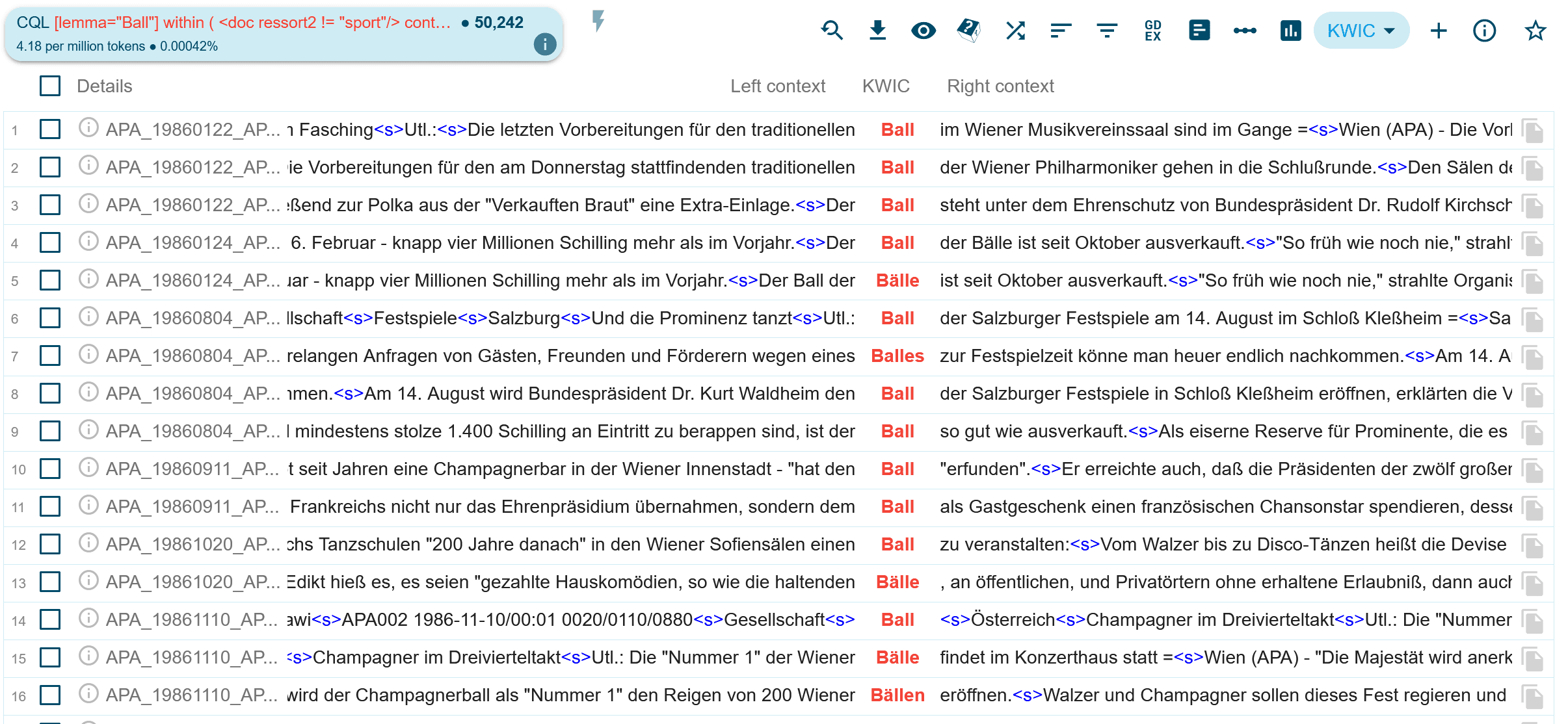 Die oben genannte Suche liefert im AMC 4.2. Ergebnisse, die sich auf “Bälle” im Sinne von “Tanzveranstaltungen” beziehen. Die mit containing gesuchten Lemma müssen nicht in direkter Nachbarschaft des Suchbegriffs “Ball” vorkommen, sehr wohl aber in den Artikeln, aus denen die Suchergebnisse stammen.