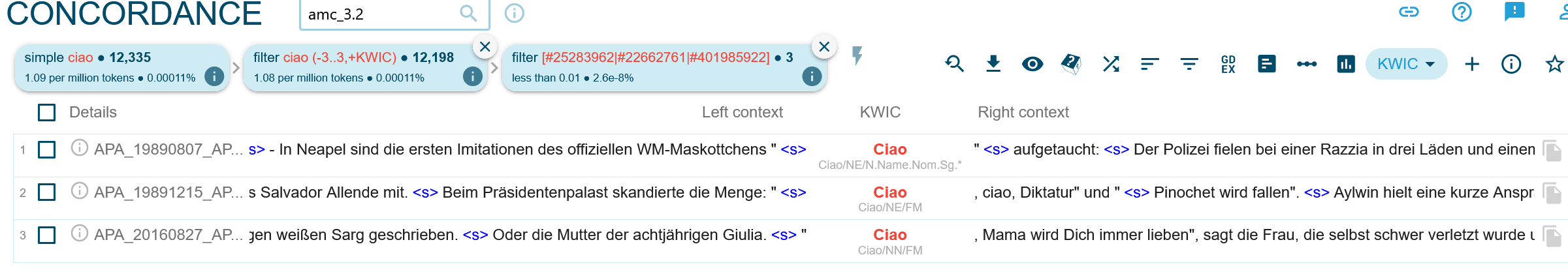 Einfache Token-Suche nach ‘ciao’ als Lemma.