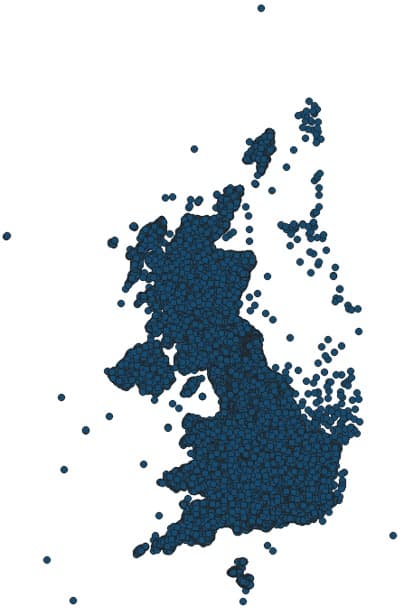 • You should now be able to see all of the places from within the GeoNames file visualized within QGIS, covering all of Great Britain.