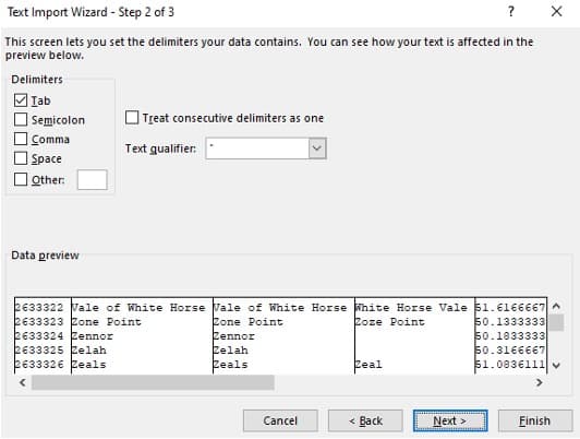 Use Excel to open the file GB.txt using the techniques we learned in step 1. This time, it is a text file that is delimited using tabs, so make sure that you select Tab as the delimiter in step 2 of the Import Wizard (as shown below).