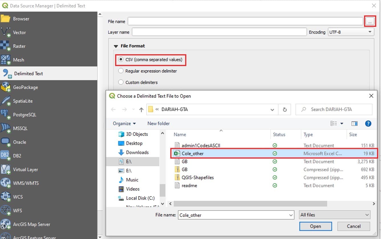 • Select Layer > Add Layer > Add delimited text layer to add the file into QGIS.