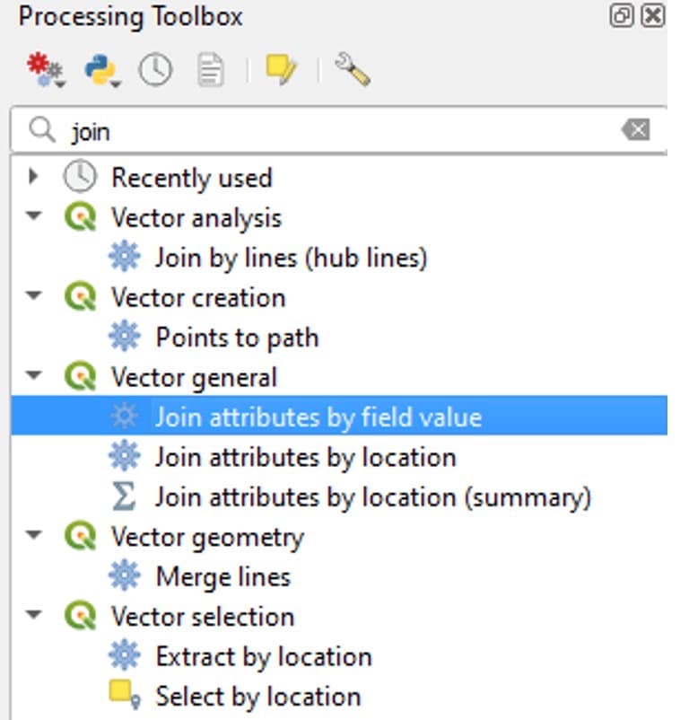 • First, open the Processing Toolbox again (as we did in Step 3c) This time, type ‘join’ into the search box and locate Join attributes by field value (under the ‘Vector general’ heading). Double-click on this.