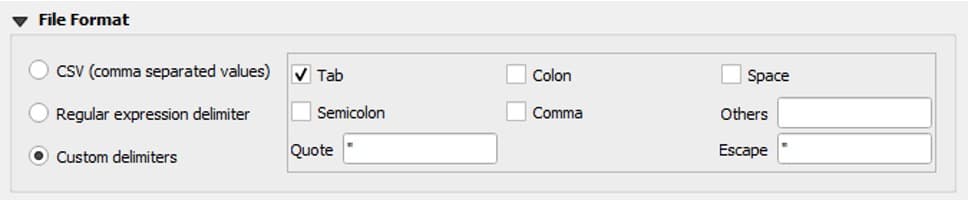 • As in step 1c, you can add this new text file to QGIS by selecting Layer > Add Layer >Add delimited text layer and locating the GB_Gaz file. This time, however, we need to tell QGIS that this is a tab delimited file (rather than comma delimited). To do this, simply select Custom Delimiters under the File Format section, then select Tab. Click to add this data when you’re ready.