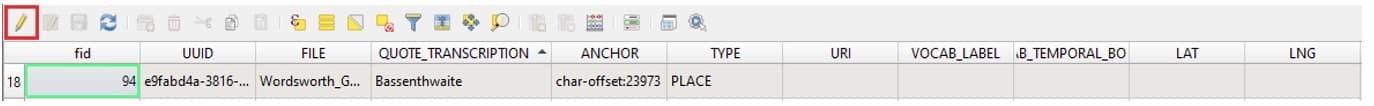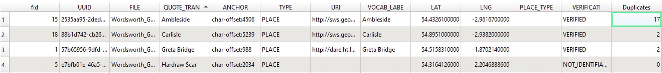 Now imagine that we have assigned geometries and coordinates to all of our unidentified places (for the purposes of this tutorial, we won’t go through all of them). You may have already noticed that the attribute table for Wordsworth-Recogito-GPKG contains many duplicate entries for the same place (e.g. there are multiple rows with instances of Lake Windermere). Left-click on the QUOTE_TRANSRIPTION column header (to sort data alphabetically) to check this. These duplicates represent each individual instance of the annotation within our text. For visualising this data within GIS, however, we need it is more useful to remove these duplicates, cleaning our data. We will walk through this process now.