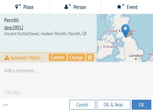 • Using its pre-loaded gazetteers, Recogito has identified an Automatic Match for Penrith. In this case, the automatic match is correct, so we can click Confirm. Make sure you then click OK to ‘save’ the annotation (otherwise, it will disappear!)