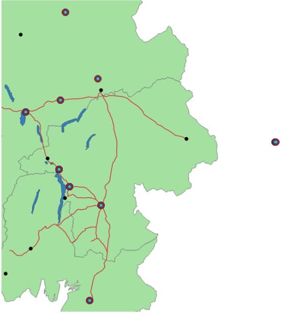 • This will add a new layer to your QGIS project called ‘Joined layer’. As you might expect, this produces a point layer that (most likely) shows exactly the same locations that you were able to georeference within Recogito (mirroring your Wordsworth-Recogito layer). You can see this is the case on the example image to the right, with the larger red dots showing the Joined layer, and the lighter blue dots showing the Wordsworth-Recogito layer.
