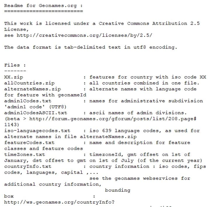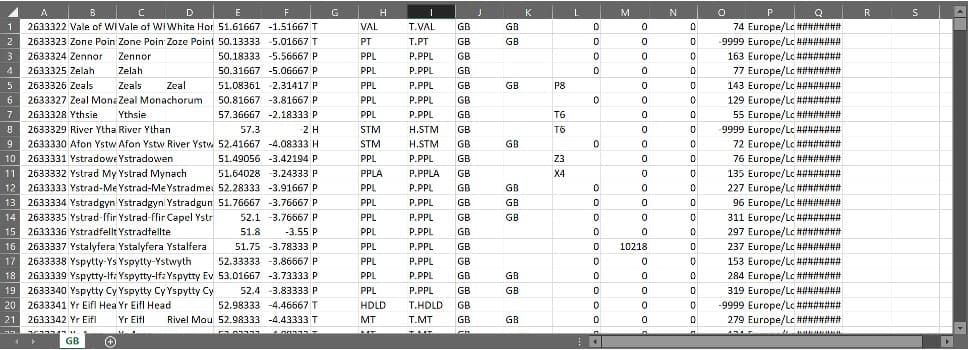 This interface is intended to aid users who wish only to look up information on a particular place; however, it is also possible to download all of the data for a particular country. In this practical, you will use the GeoNames ‘country file’ containing entries for the UK, GB.txt. This has already been downloaded to the DARIAH-GTA.zip file for you. Other country’s data is available by following the link to Free Gazetteer Data under the Download heading_._