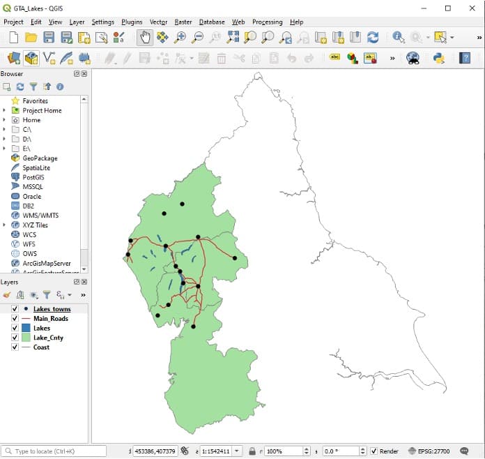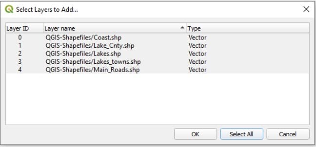 • Click Add within the Data Source Manager. QGIS will then ask you which Layers you would like to add. Select all those that appear within the ‘QGIS-Shapefiles’ folder, as follows: (Coast.shp; Lake_Cnty.shp; Lakes.shp; Lakes_towns.shp; Main_Roads.shp)