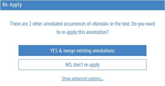 • Whenever you create an annotation in Recogito, it will automatically search the rest of your text to see if there are any repeat occurrences. If so, you can re-apply your annotation. Find Kendal (at the end of the third paragraph) and annotate it. When prompted, click YES to apply your current annotation to future occurrences.