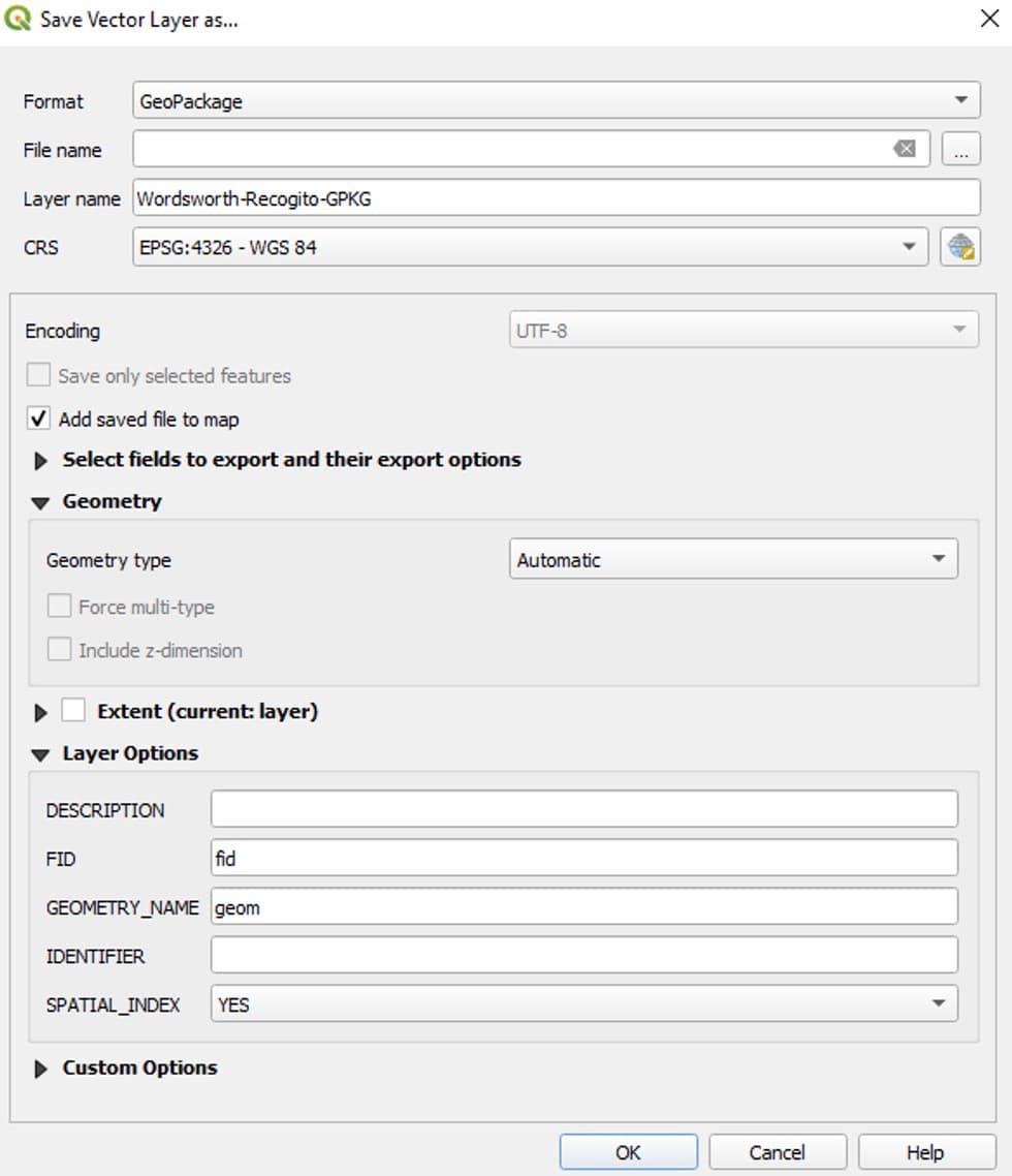 • Make sure to save this new layer to your computer, calling it Wordsworth-Recogito-Points. Leave all the other options as they are, and click Run when ready.