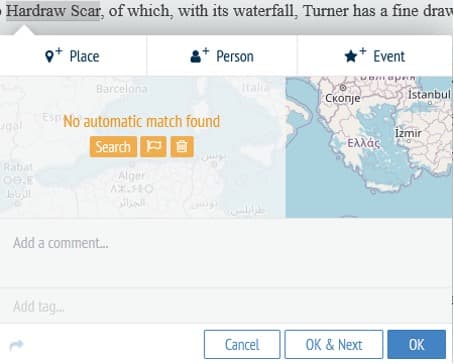 • Recogito uses multiple gazetteers, so the first ‘Automatic Match’ may not always be correct, or it may not be able to identify any match at all. To see what this looks like, annotate Rokeby (a few lines after Penrith)