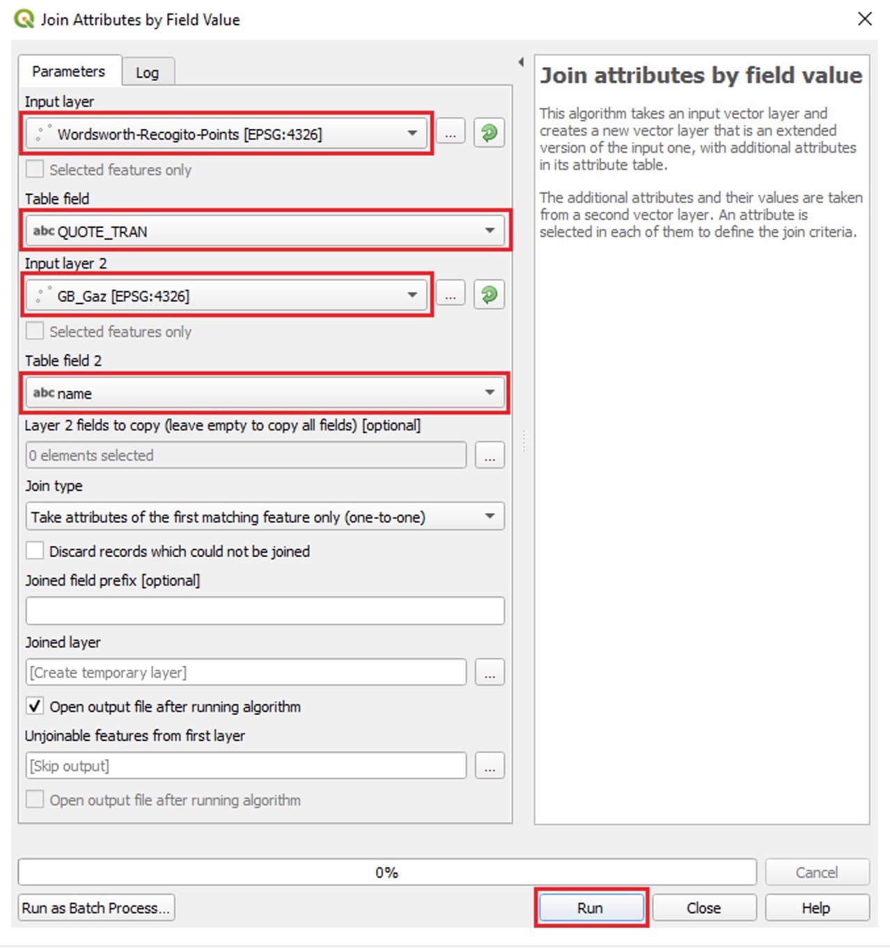 • This will open the ‘Join Attributes by Field Value’ dialogue box. For Input layer, select Wordsworth-Recogito-Points, with the Table field as QUOTE_TRANSCRIPTION (this selects the column within Wordsworth-Recogito that contains the annotation you created within Recogito). For Input layer 2, select GB_Gaz, with Table field 2 as name.