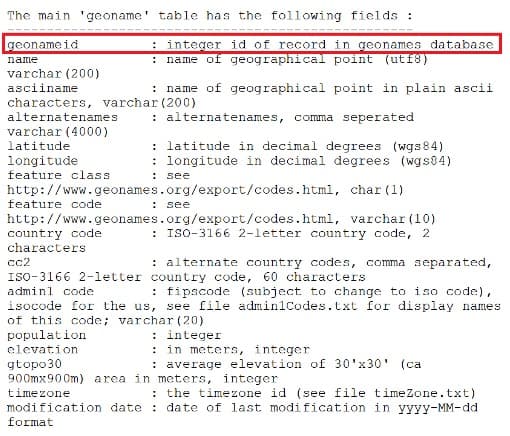 • In addition to the field heading, the information after the colon (:) provides some additional metadata about the content of the field. Thus, we are told that the entries in the ‘geonameid’ field are integer (numerical) identifiers.