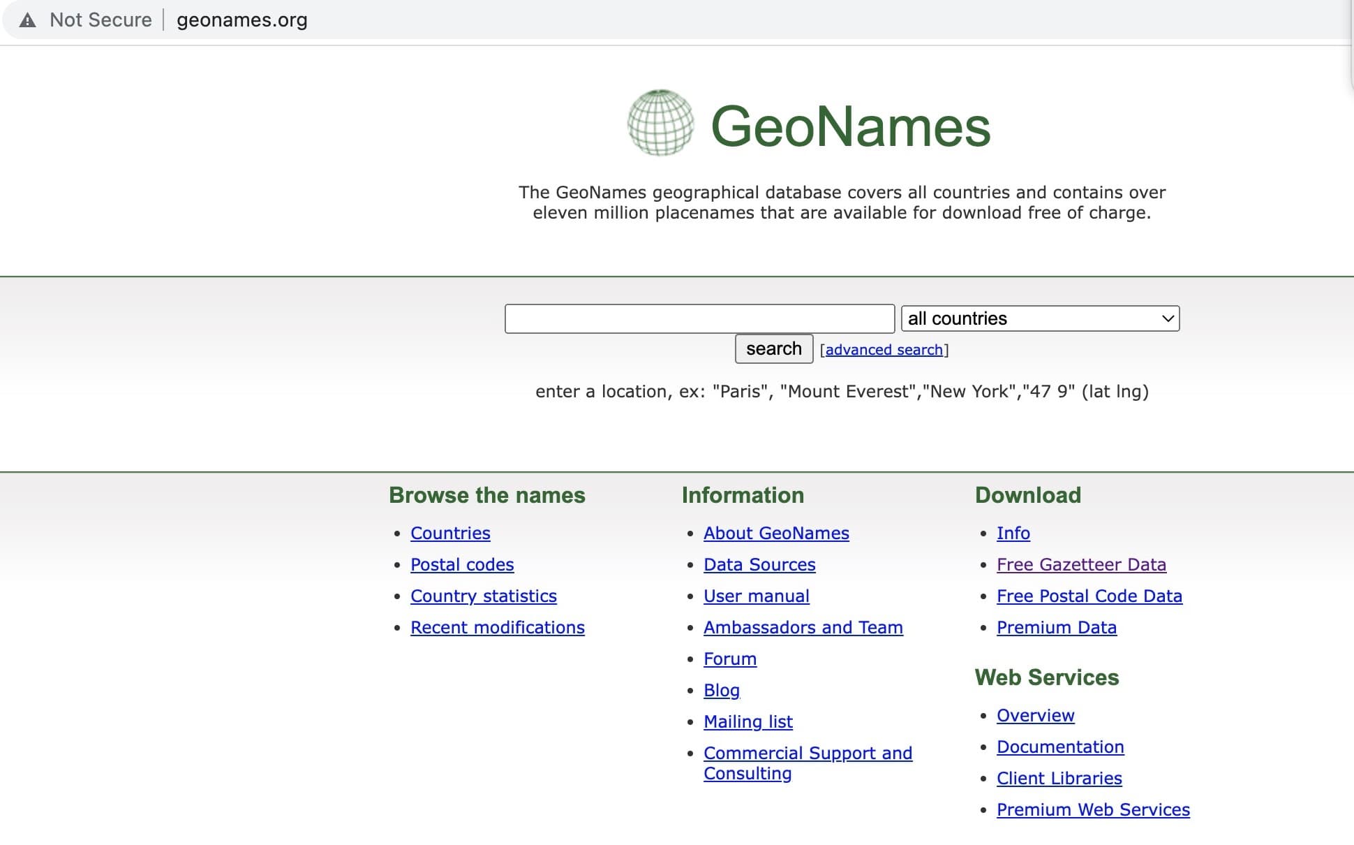 Gazetteers can be particularly useful, if not crucial, for performing this task. A gazetteer can be thought of as a sort of ‘geographical directory’ that provides basic reference information about the geographical makeup of a country, a region, or even a continent. From a GIS perspective, a gazetteer must contain a minimum of place names and coordinates for those places. It may also contain additional information such as population size, areas, heights, feature types (town, mountain, river, etc.), and so on. Gazetteers are becoming increasingly available for free. In this exercise we will look at the GeoNames gazetteer (www.GeoNames.org) in particular, however, many other gazetteers are also available. We will also encounter GeoNames and some other gazetteers when we annotate place-names in a text within Recogito, an online annotation tool.