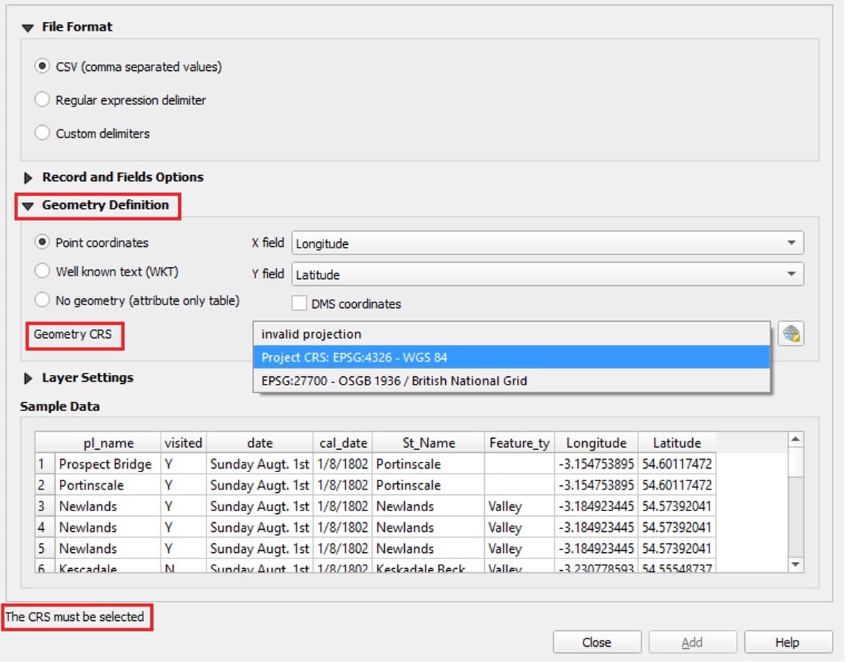 • Click on Geometry Definition to expand this section. You will see that QGIS should, by default, have assigned the ‘X field’ to Longitude and ‘Y field’ to Latitude. Double check that this is the case. Then, select the Geometry CRS drop-down menu. QGIS should have already detected a Coordinate Reference System from the shapefiles we previously added, so you can select Project CRS: EPSG:4326 – WGS 84. Once this is selected, click Add to add these layers to your project.