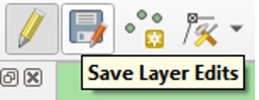 • You can now click the Toggle Editing icon to turn editing off. If you haven’t already saved your edits, QGIS will ask you if you want to save before turning editing off.