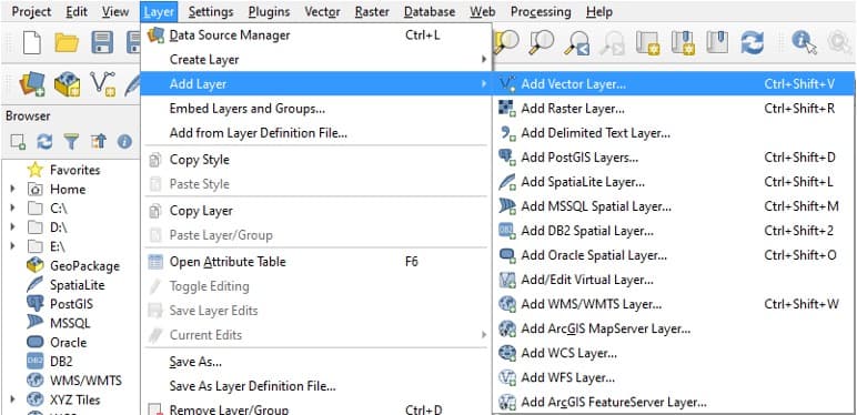 • We can now start loading our other data. Once again, select Layer > Add Layer from the drop-down menu. This time, though, we will use Add delimited text layer.