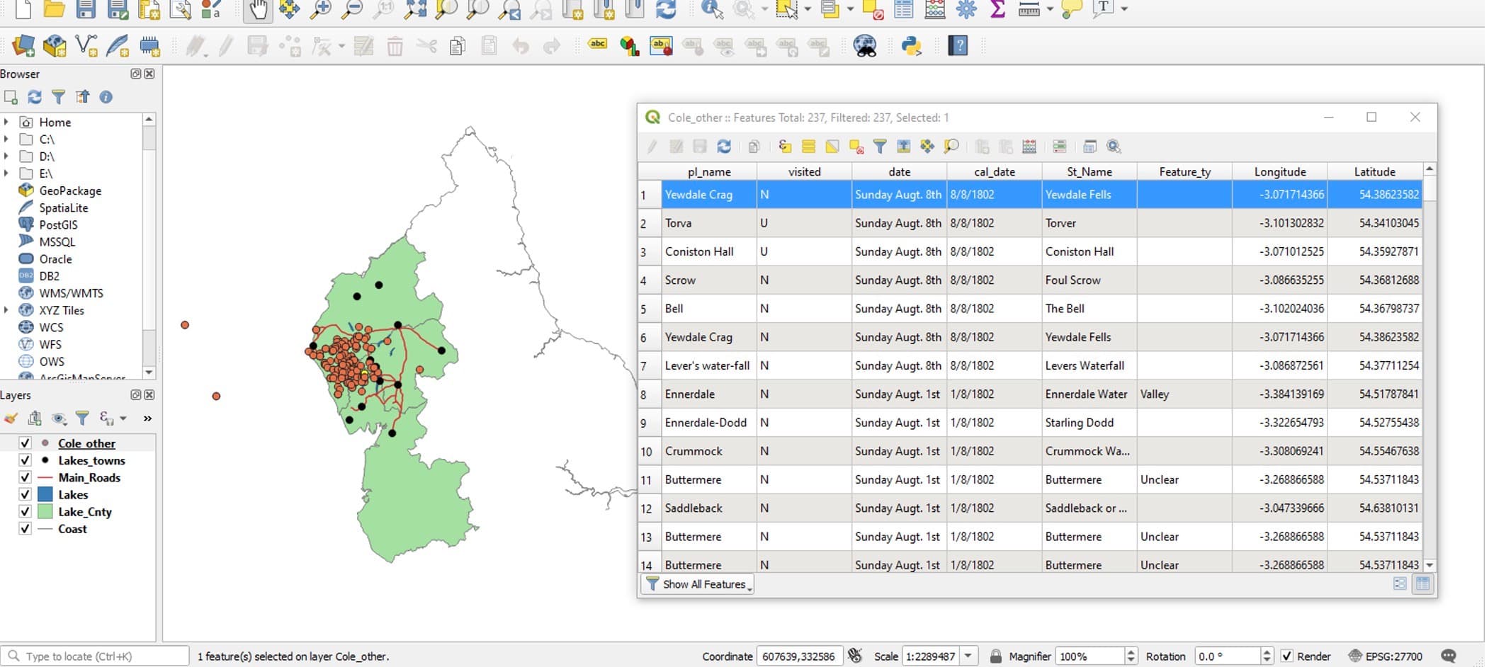 2. Consider what types of research question you could ask/answer with your Wordsworth and Cole datasets. What other spatial information might you need to answer more complex questions? How would you account for any places that you were unable to locate, and are therefore missing from your GIS dataset?