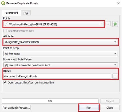 • When the Remove Duplicate Points window opens, select your ‘Wordsworth-Recogito-GPKG’ layer for the Points option, then select ‘QUOTE_TRANSCRIPTION’ for the Attribute option. This tells the tool to search this column from our table to identify any duplicates.