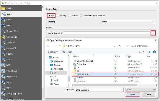 • This opens the ‘Data Source Manager’ – click the three small dots next to ‘Vector Dataset’ and navigate to the DARIAH-GTA folder you downloaded earlier, locate the QGIS-Shapefiles.zip file within the folder and click to Open this file.