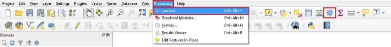 • To start manipulating our data, we need to open the Processing Toolbox in QGIS. To do this, you can select Processing > Toolbox from the drop-down menu at the top, or you can click on the ‘gear’ icon highlighted in red below: