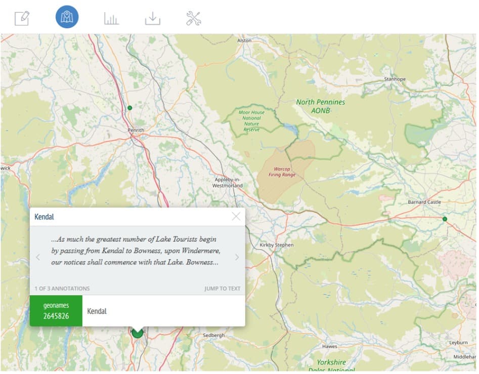 • As you can probably guess, this chapter excerpt contains lots of place-names for the Lake District and surrounding area. We are going to annotate these places within Recogito, and then extract this data for use in QGIS. Recogito also has an in-built gazetteer (which draws on various different sources, including GeoNames), which we can use to assign coordinates to the more well-known or obvious locations.