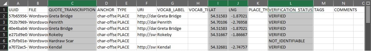 Note: it is also useful to notice that the ‘QUOTE_TRANSCRIPTION’ column from our Recogito data retains the place-name spelling as it appeared in our original source material. It is important to maintain this data, alongside the ‘normalised’ spellings that appear in gazetteers such as GeoNames. This allows users of your data (including yourself!) to keep track of any differences/alterations.