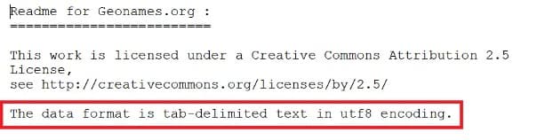 Within the DARIAH-GTA.zip file you downloaded earlier, you will find the readme.txt file. This was downloaded from the GeoNames site and is useful to understand both the content and structure of the gazetteer data file. Open the readme.txt file using WordPad (to do this, right click on the file in Windows Explorer, and select Open with > WordPad). You should see something like this: