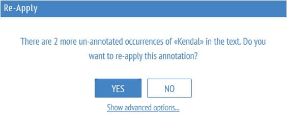 • The automatic match for Kendal may be incorrect, so make sure to change it to Kendal, England (as you did with Rokeby). When you have confirmed the place, Recogito will ask if you want to re-apply this change to future annotations. Select YES.