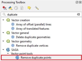 • When the Processing Toolbox appears on your screen, search for ‘duplicate’ in the ‘search’ bar. Double-click with the left mouse button to open the Remove duplicate points tool.