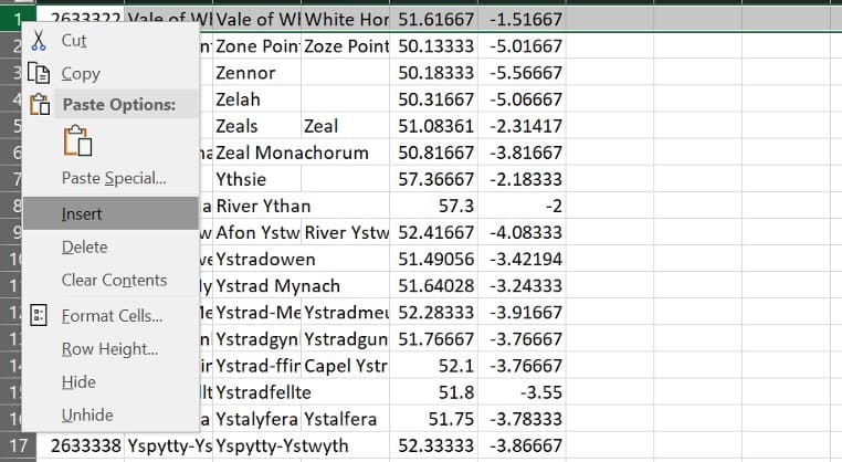 There are two things to notice. First, this file does not contain column headings, so you will need to add these as described below. Second, the file contains a lot of fields that you may not want – effectively everything after latitude, so from column G (“Feature Class” according to the metadata) onwards.