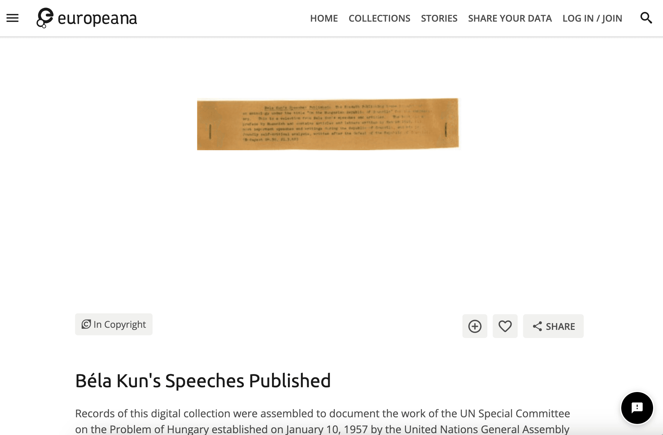 For instance, looking deeper into Costis’ dataset, Prof. Lorena selects two different objects from the Europeana results related to the same topic: an image provided by the Workers Museum depicting Bela Kun (illustrated in Fig.2), one of the leaders of the Hungarian Revolution, and a text containing a speech by the same person (illustrated in Fig. 3). Using these two records, which are related to the same person, she explains to Costis the importance of documenting this information not by plain text, but by representing this person as an entity. By doing so, all records associated with that person can be related to this entity, resulting in a rich representation of all the available information about Bela Kun.